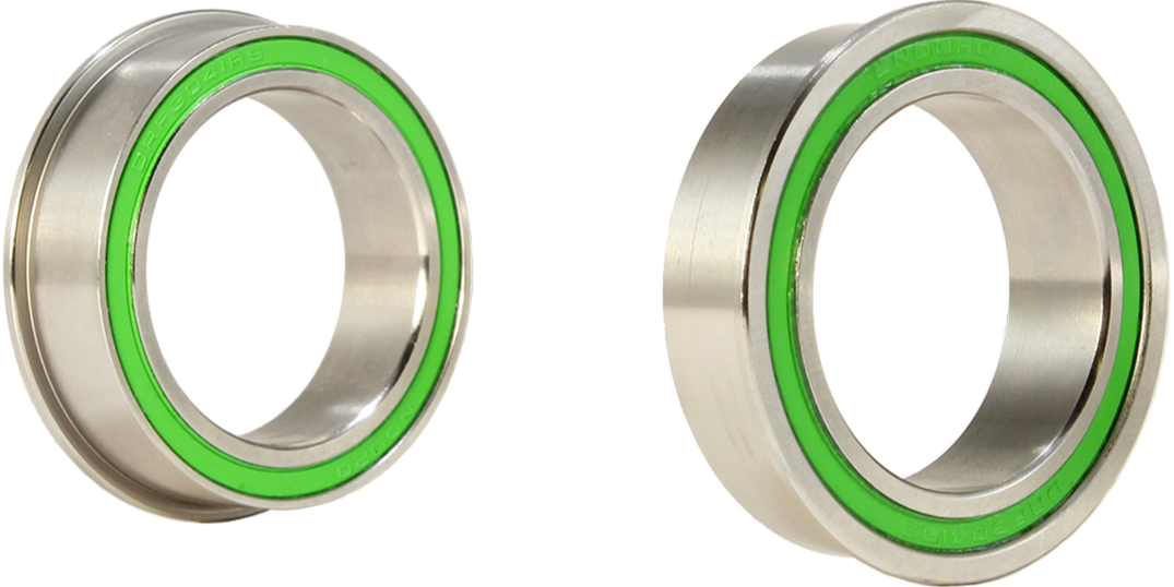 This complete bottom bracket features Flanged, Double-Row bearings with 440C stainless steel balls and races to provide long life and superior corrosion resistance in applications and environments that may be less than ideal. Included with the kit are seals to protect the bearings from the elements and selection of spacers to allow you to precisely tune your chain-line.
