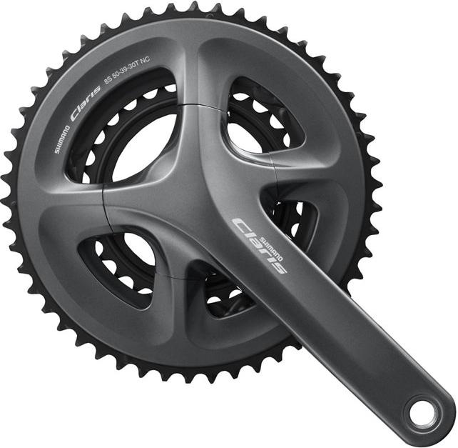 The SHIMANO CLARIS 3x8 speed road crank uses a high-end 4-arm design and compact 50-39-30T chainrings. The CG model includes an integrated chain guard.