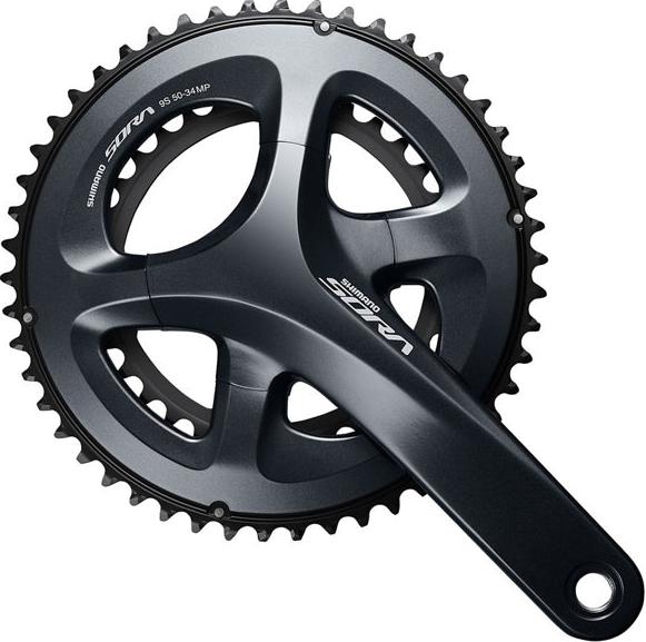 The SHIMANO SORA 2x9 speed road crank uses a high-end 4-arm design and compact 50-34T chainrings and is available in 165, 170, and 175mm crank arm lengths.