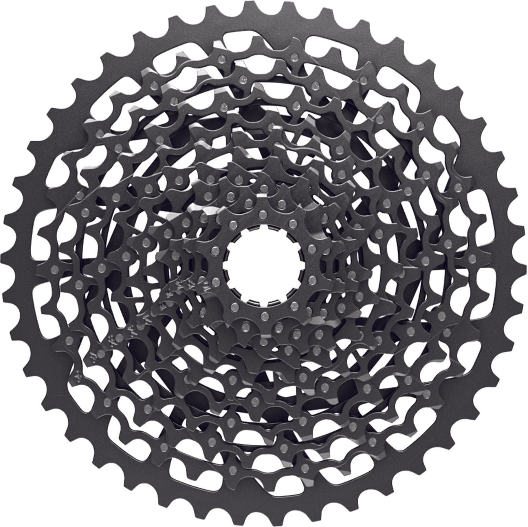 FULL PIN™ technology uses eleven lightweight, stamped steel cogs held together with 123 high-strength stainless steel pins. The result: a cassette that's light, durable and equipped with SRAM's super wide 10-42t gear range that's a perfect fit for any ride. The open design similar to our X-DOME™ cassette aids in mud clearance, giving you cleaner shifting performance and longer component life.
