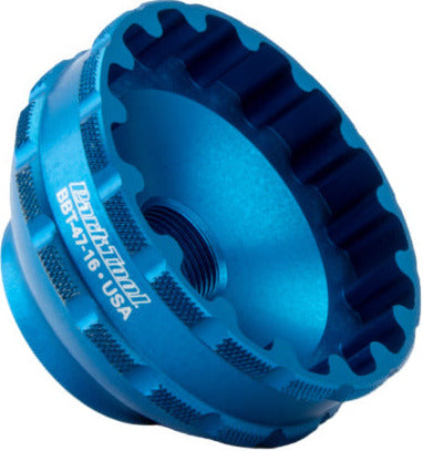 A precision CNC-machined aluminum tool for the installation and removal of select threaded bottom brackets with 16-notch tool fittings, including Enduro® T47 and PF30 bottom brackets. Manufactured in-house by Park Tool, anodized for easy identification and featuring a ratchet/torque wrench-compatible 3/8" drive.