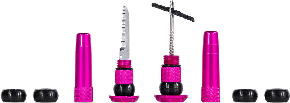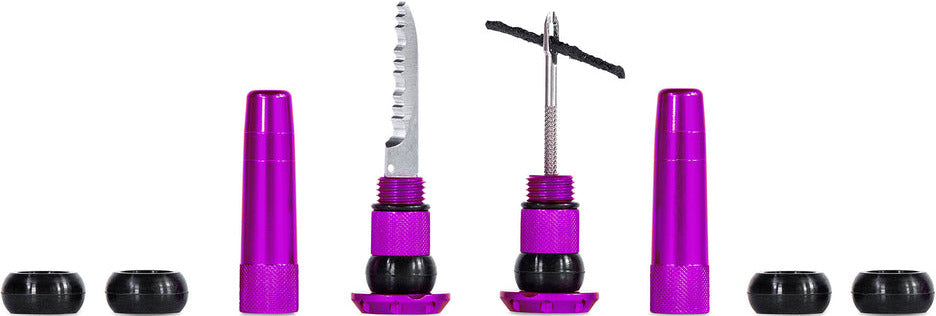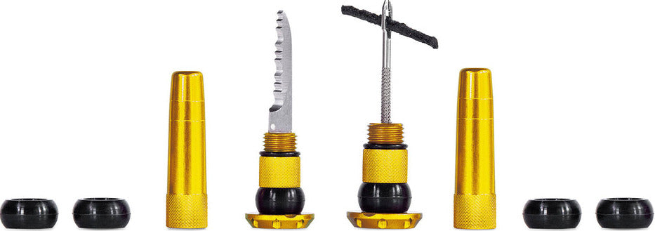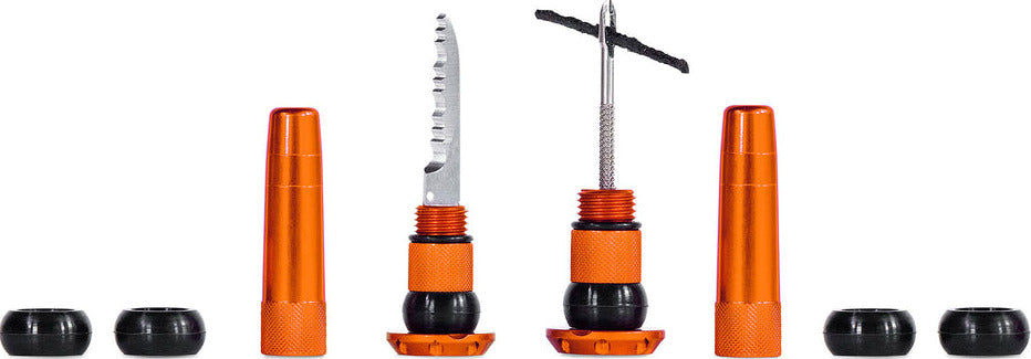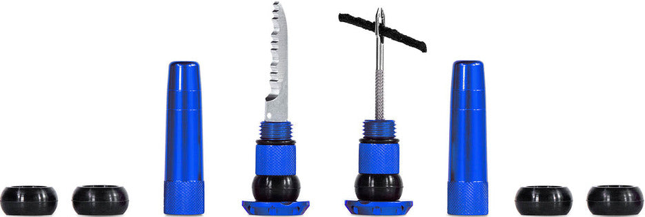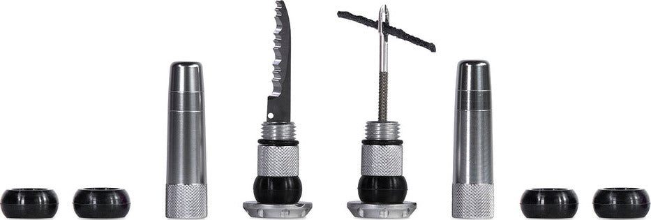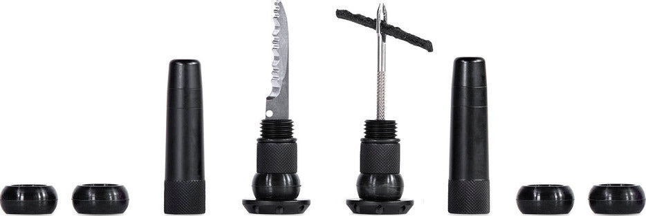 Each lightweight and durable set contains everything you need to get back riding when you’re stuck battling a hole that’s just not sealing: a stainless steel 2-in-1 puncture plug reamer tool, a variety of different sized tire worms and a trimming knife.