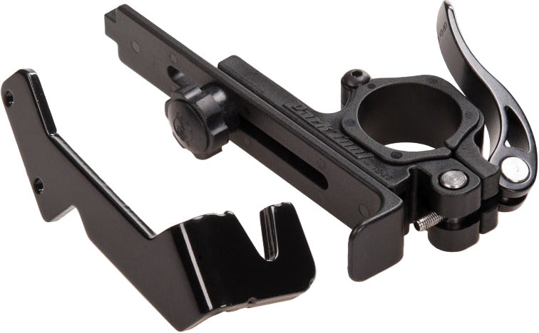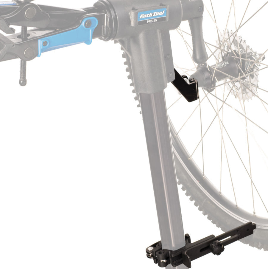 A handy accessory for making quick truing adjustments in situations where bringing a full-sized truing stand is not practical or possible. The PRS-25 installs easily onto the top tube and upright of select Park Tool portable repair stands and can be used while a bike is installed in the repair stand. Securely holds any quick release or solid axle wheel, and adjusts for any wheel diameter and rim width.