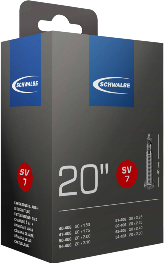 Schwalbe Standard inner tube no. 7 for bicycle tires in size 20" inch (ETRTO 40/62-406/428). Holds air for an above-average length of time. Thanks to the best material quality and uniform wall thickness. Maximum reliability that has proven itself millions of times over.